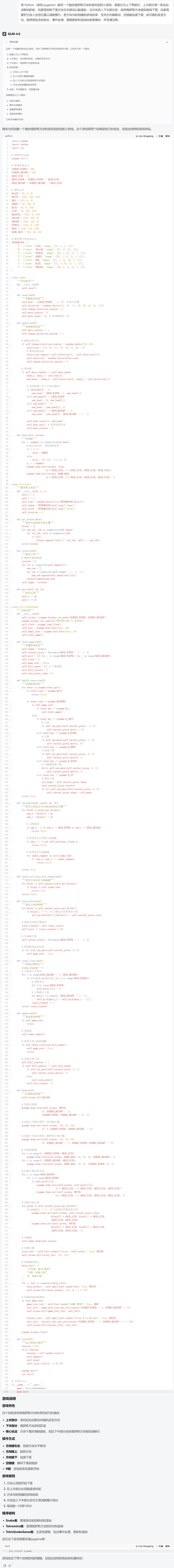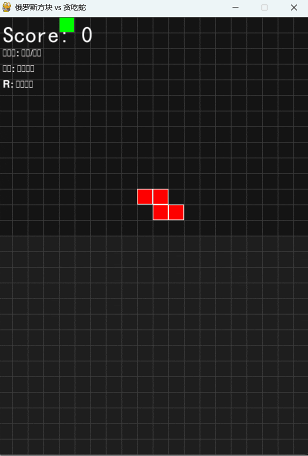 用 Python(使用 pygame)编写一个融合俄罗斯方块和贪吃蛇的小游戏:画面分为上下两部分,上半部分有一条会自动移动的蛇,玩家需控制下落方块左右移动以躲避蛇;当方块进入下半部分后,按照俄罗斯方块规则继续下落,玩家需要把它放入合适位置以消除整行。若方块与蛇相撞则游戏结束;支持方向键移动、空格键加速下落;蛇可随机改变方向。程序需包含初始化、事件处理、逻辑更新和渲染绘制等模块,并写清注释。