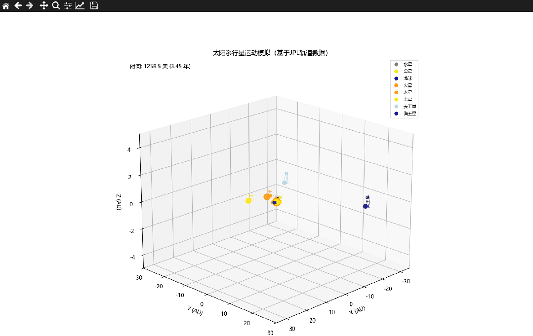 请使用 Python 创建一个太阳系动态可视化演示,大体基于真实天文数据,但太阳大小可适当缩小以方便查看:包含太阳和八大行星(水星至海王星),采用 JPL 提供的轨道六根数初始化各行星轨道;以太阳系质心为参考点,利用牛顿万有引力定律构建运动微分方程,并通过数值积分模拟行星在三维空间中的轨迹;使用 matplotlib 的 3D 绘图功能实时动画展示行星绕日运动,正确体现轨道倾角、椭圆偏心率及相对公转周期;坐标轴单位为天文单位(AU),时间步长可调,并在图中标识各行星名称;代码需结构清晰、注释完整,并说明所作简化(如忽略行星间引力摄动或仅考虑日心引力)。界面使用微软雅黑字体。