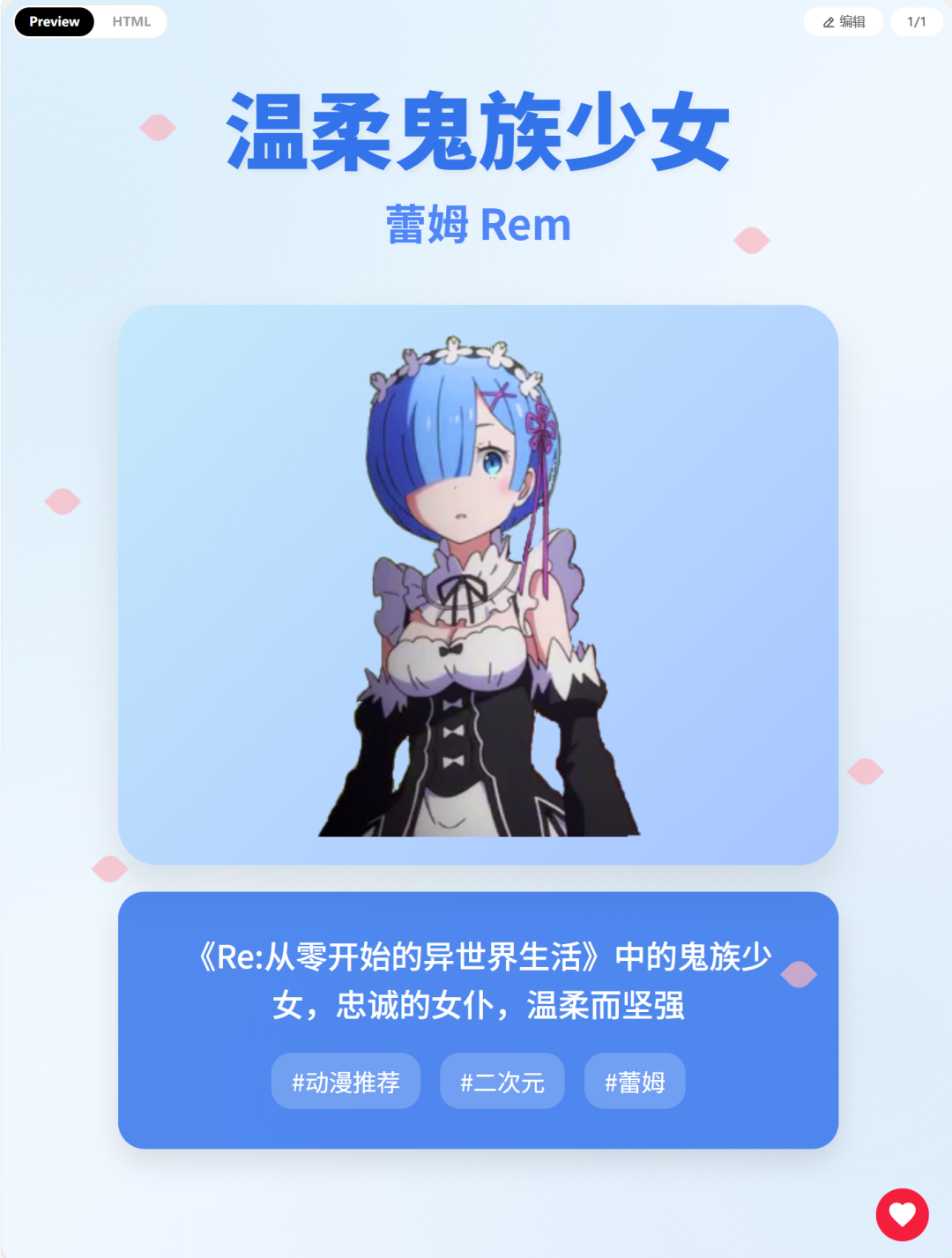 除了上述硬核能力,GLM-4.6 也集成了多模态生成等便捷功能。在预设的 AI PPT 和灵感画板模式中,模型可以快速将想法变为现实。比如,我们让它生成了一张介绍「蕾姆」的小红书风格封面图。