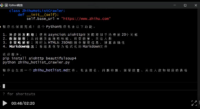 写一个 Python 程序,使用 asyncio + aiohttp,并发爬取前 20 个知乎热榜问题页面,提取问题标题、回答数量、关注人数,然后将结果存储为一个 MD 文件。